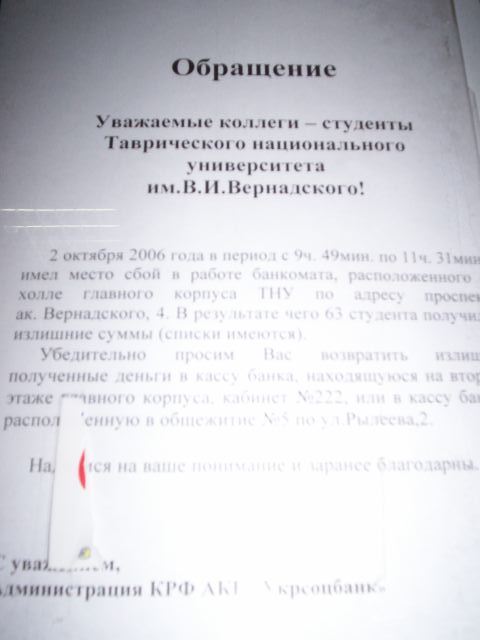 Требуется отметить, что сбой банкомата, как выяснилось позже, произошёл в результате невнимательности обслуживающего персонала: вместо барабана с десятками, он поместил барабан двадцатигривневых купюр. Вследствие чего банкомат малые суммы выдавал в два раза большими. Как-то так очень интересно получилось, что среди тех 63 человек, более половины оказались физиками 3 курса. С гордостью рассказывал моим физикам про нечеловеческую порядочность физиков: всё до последней копейки возвратили лишние средства банку!!! Наши люди такие!!! Ими надо не просто гордиться, их надо почитать!!!